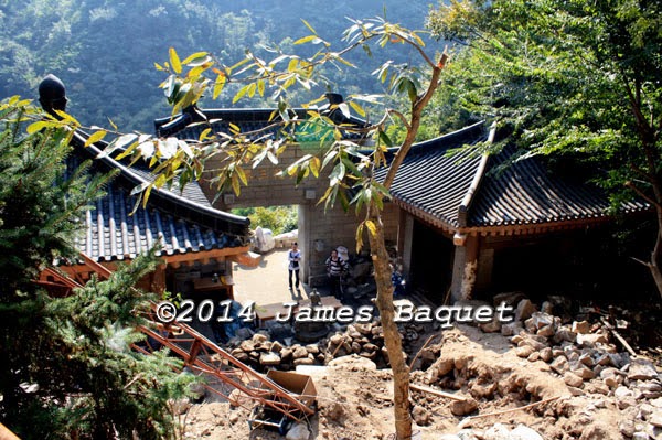 When I got out, I discovered that the gate was at the bottom, but the temple itself was a long climb. Furthermore, recent storms had washed out part of the trail; there were places where there were no steps and I had to scramble up sandy slopes. I also had to detour around makeshift equipment used by workers to haul sand and paving stones up the mountain.